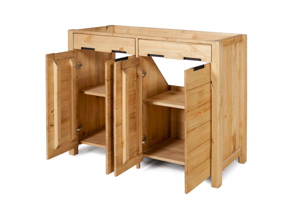 Дверки усилены рейками от расползания. Задняя стенка открыта для комуникаций. Внутри каждого отеделния за распашными дверцами по одной полке.