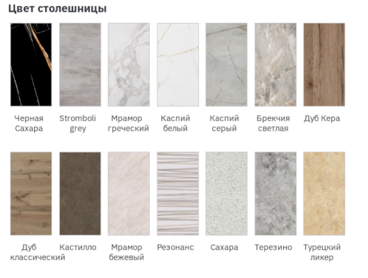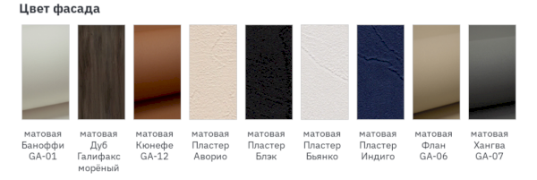Цвет фасада: матовая Баноффи GA-01, матовая Дуб Галифакс морёный, матовая Кюнефе GA-12, матовая Пластер Аворио, матовая Пластер Блэк, матовая Пластер Бьянко, матовая Пластер Индиго, матовая Флан GA-06, матовая Хангва GA-07.