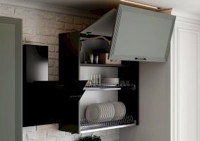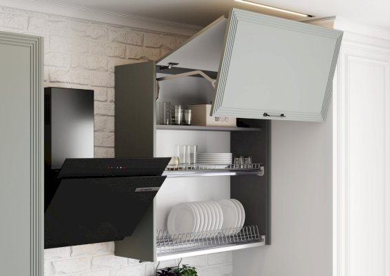 • Технология двойного открывания фасада используется для шкафа с сушкой, за счёт чего расставлять посуду гораздо удобнее.